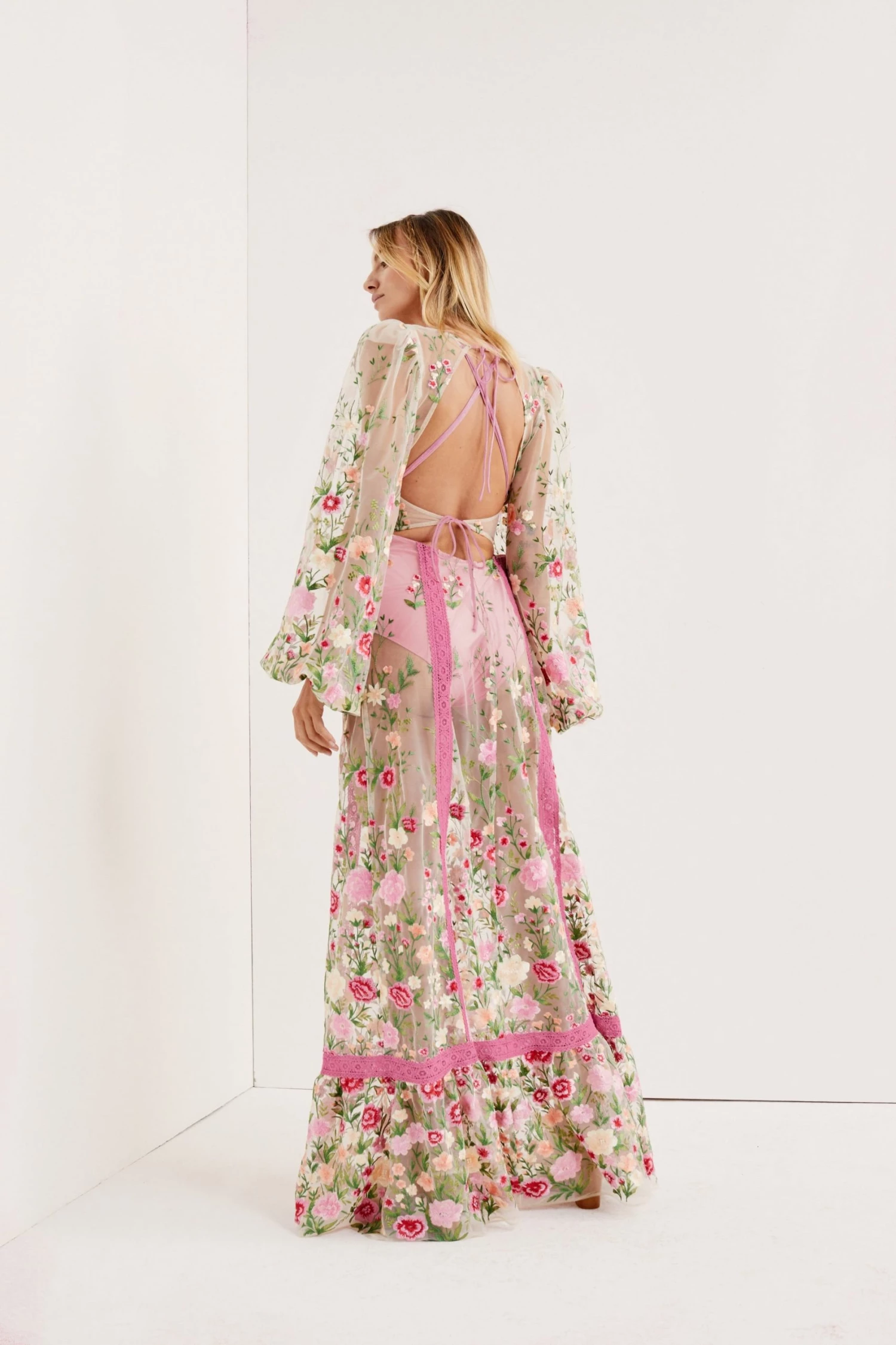 Ethereal sheer tulle maxi dress with a vibrant spring garden embroidery and a plunging neckline. Billowing sleeves, delicate tie at bodice, lace detailing throughout, built-in bra and high-waist panty.