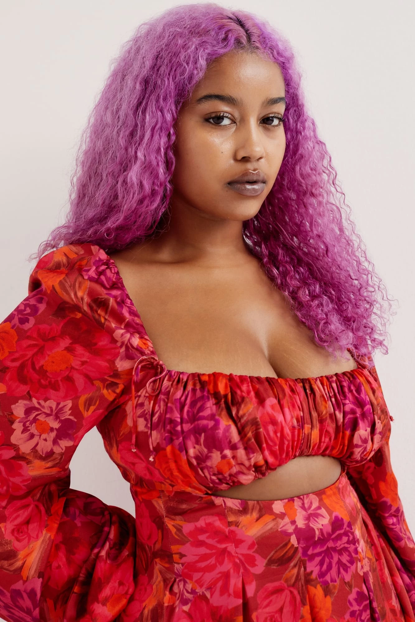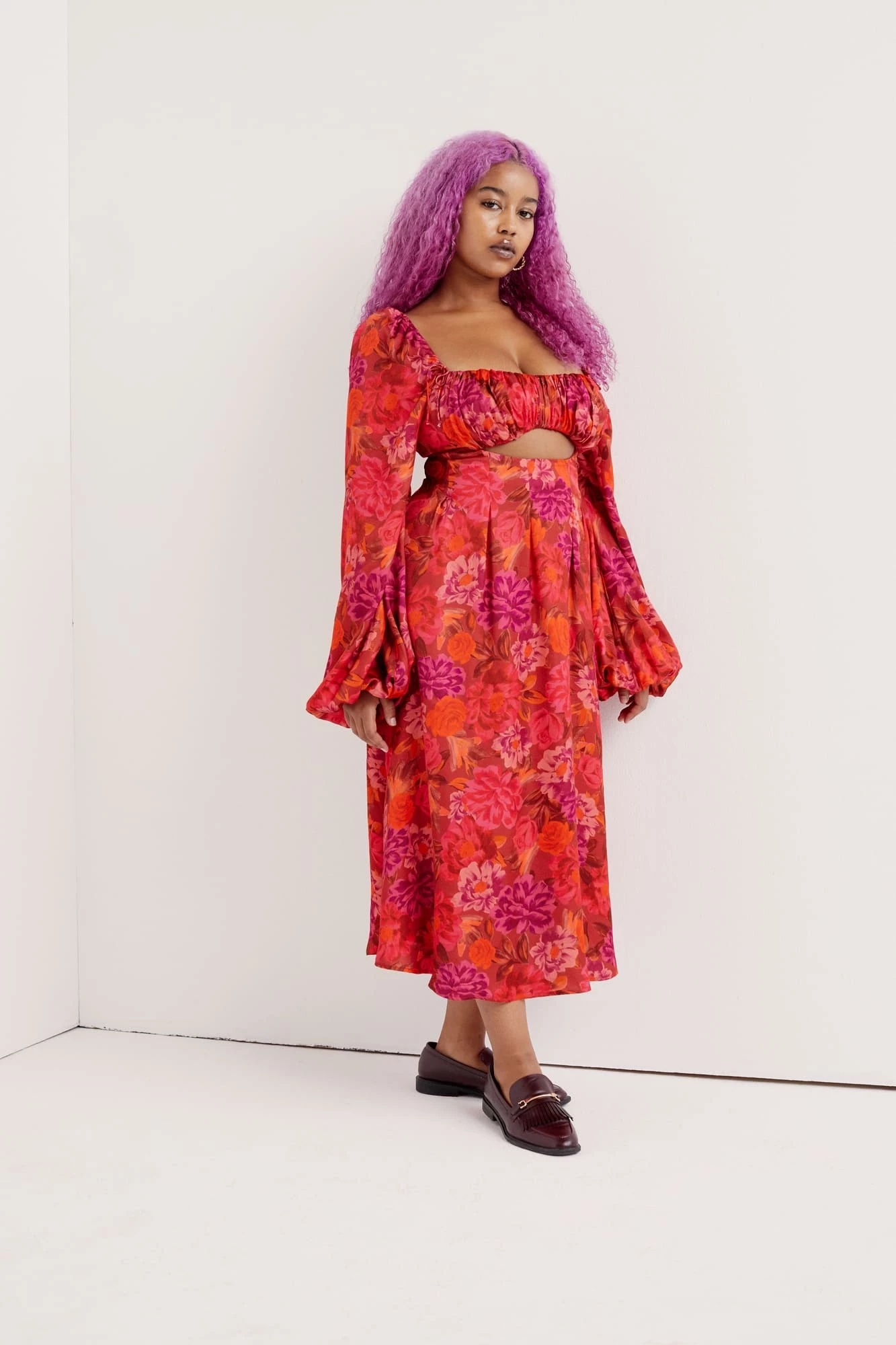 Romantic silky satin floral midi dress featuring a gathered bust, keyhole at waist and billowing sleeves. Gathering along shoulder, partially lined, invisible zipper at side.