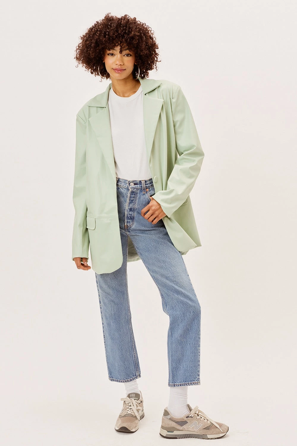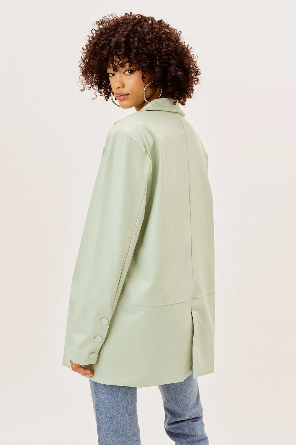 Sleek faux leather oversized boyfriend blazer featuring a sophisticated notch collar, faux pockets, and self-covered buttons along front.
