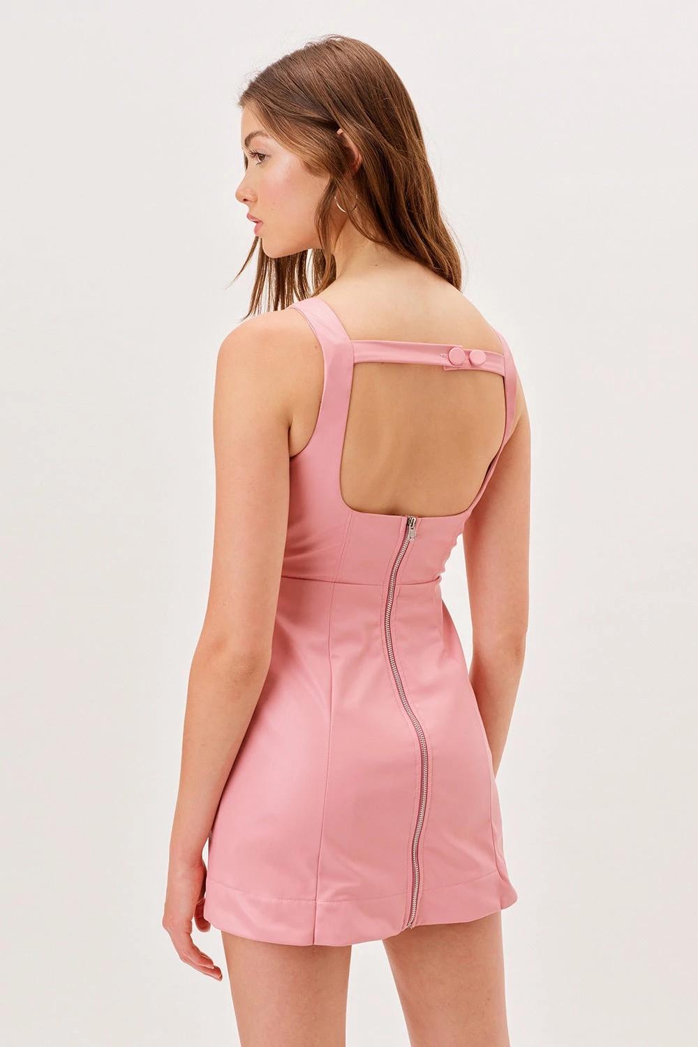 Sleek faux leather fitted mini dress featuring a square neckline, figure-flattering princess seams throughout, and a playful strap across back. Open-ended zipper along back.