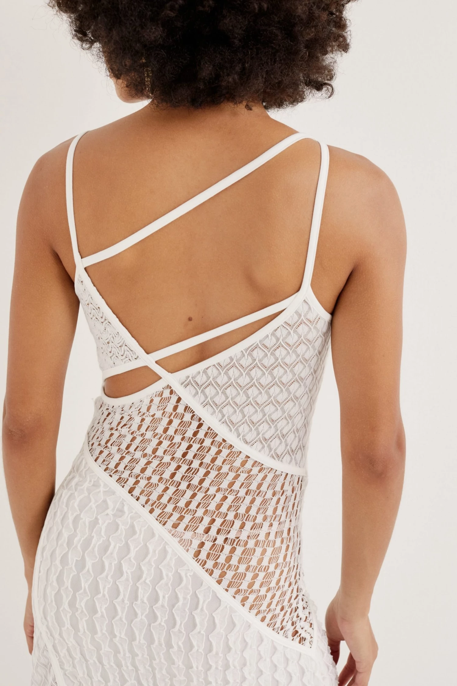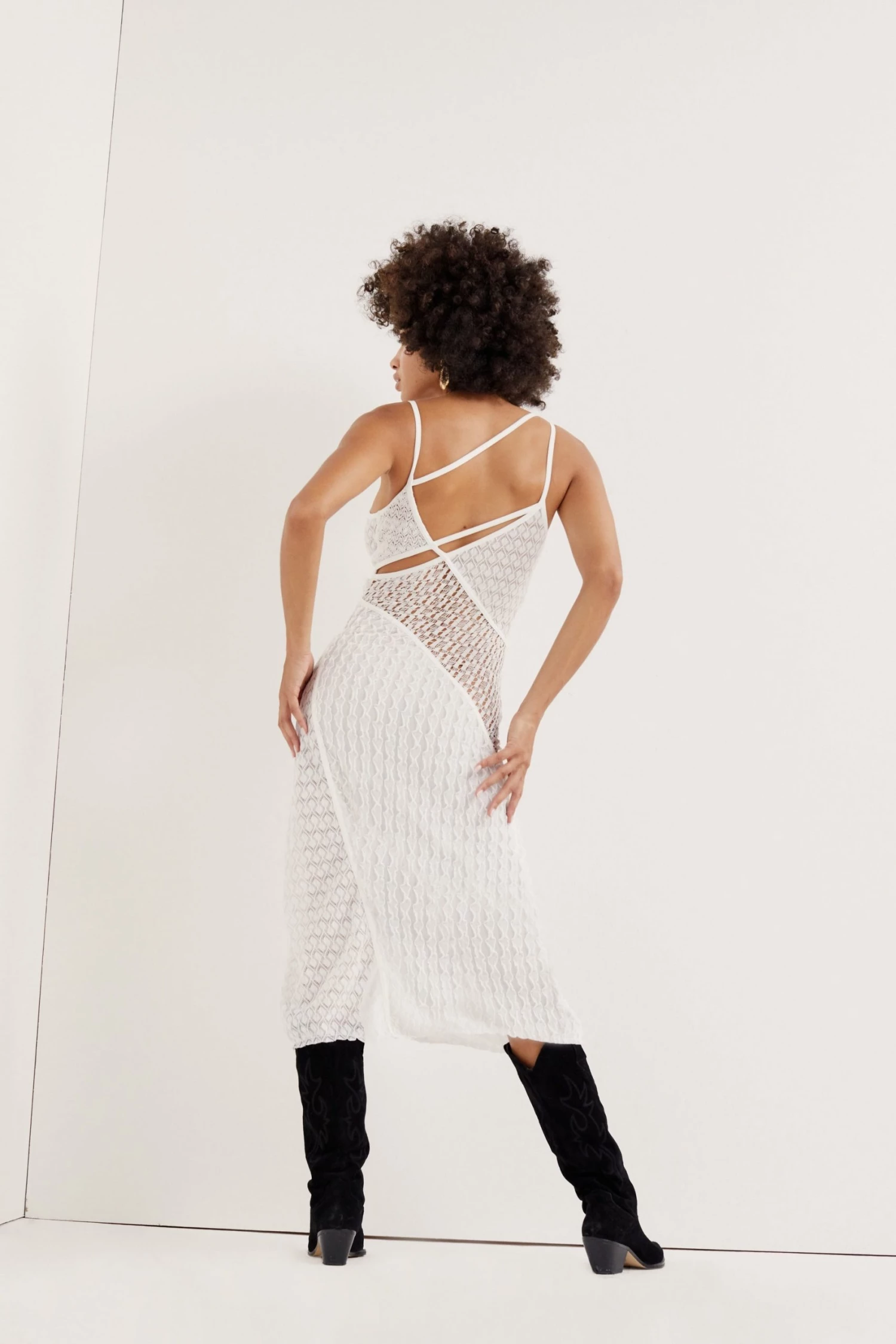 Figure-flattering patchwork knit midi dress featuring cutouts and strappy detailing throughout. Thigh-high slit, sheer panel at waist.
