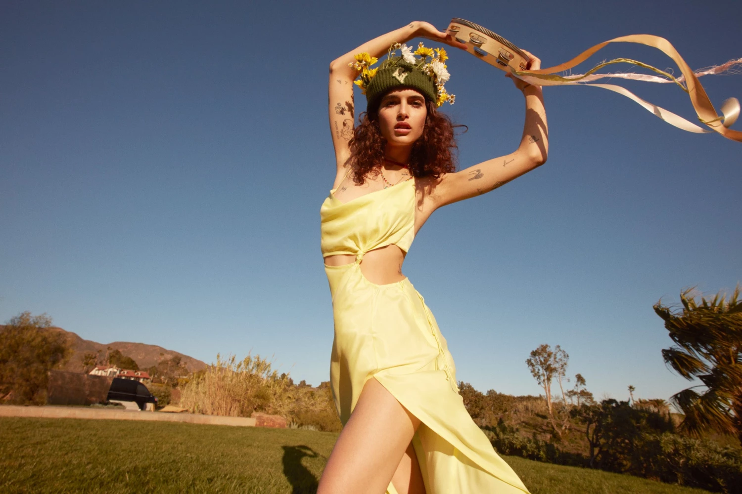 Slinky maxi dress featuring a tied front detailing a cutout waist. Delicate ties at shoulder and back with a thigh-high side slit.