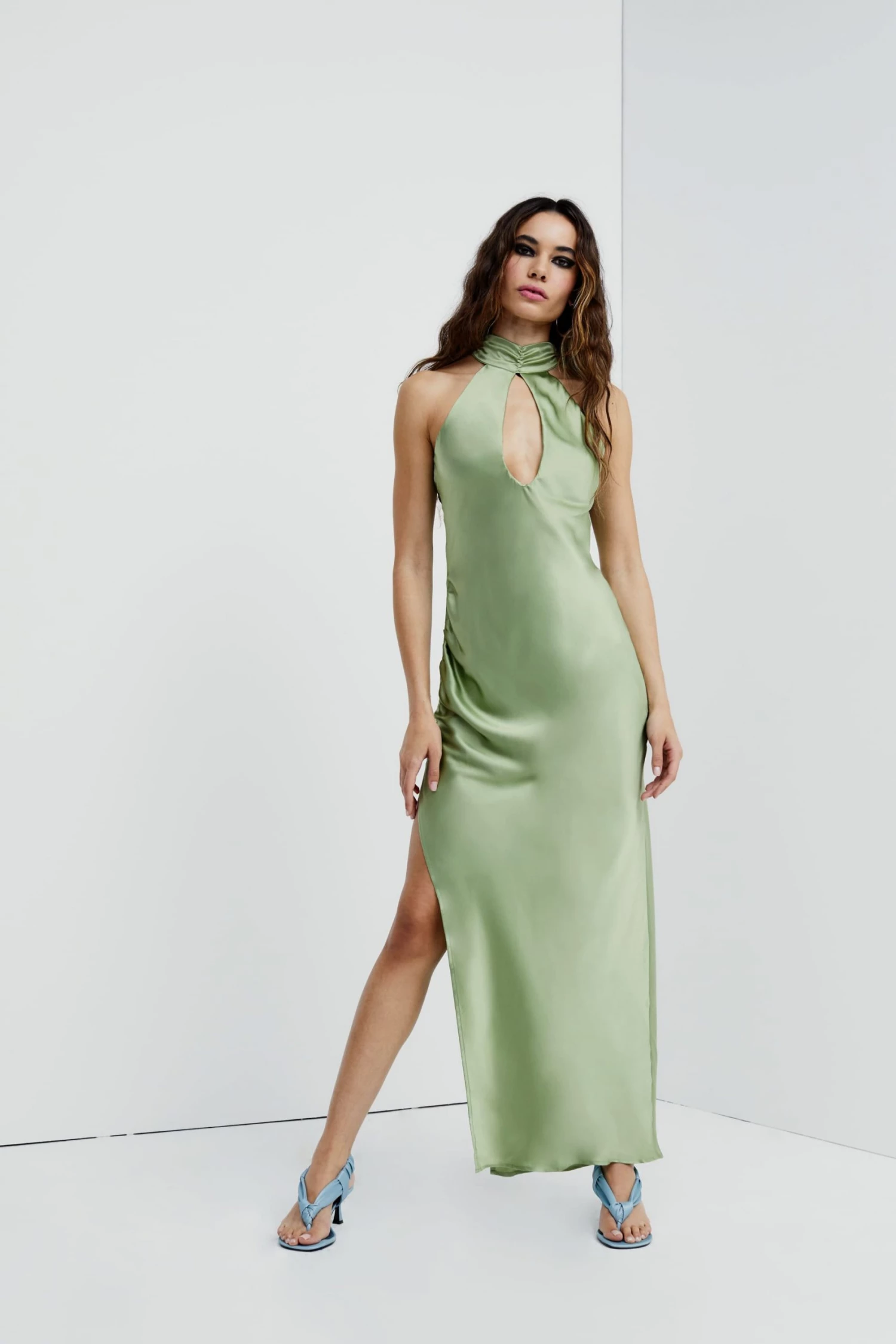Slinky silky satin column dress featuring a high neck, sexy open back and gathered high slit. Keyhole at neckline, tonal buttons at back. Invisible zipper, partially lined.