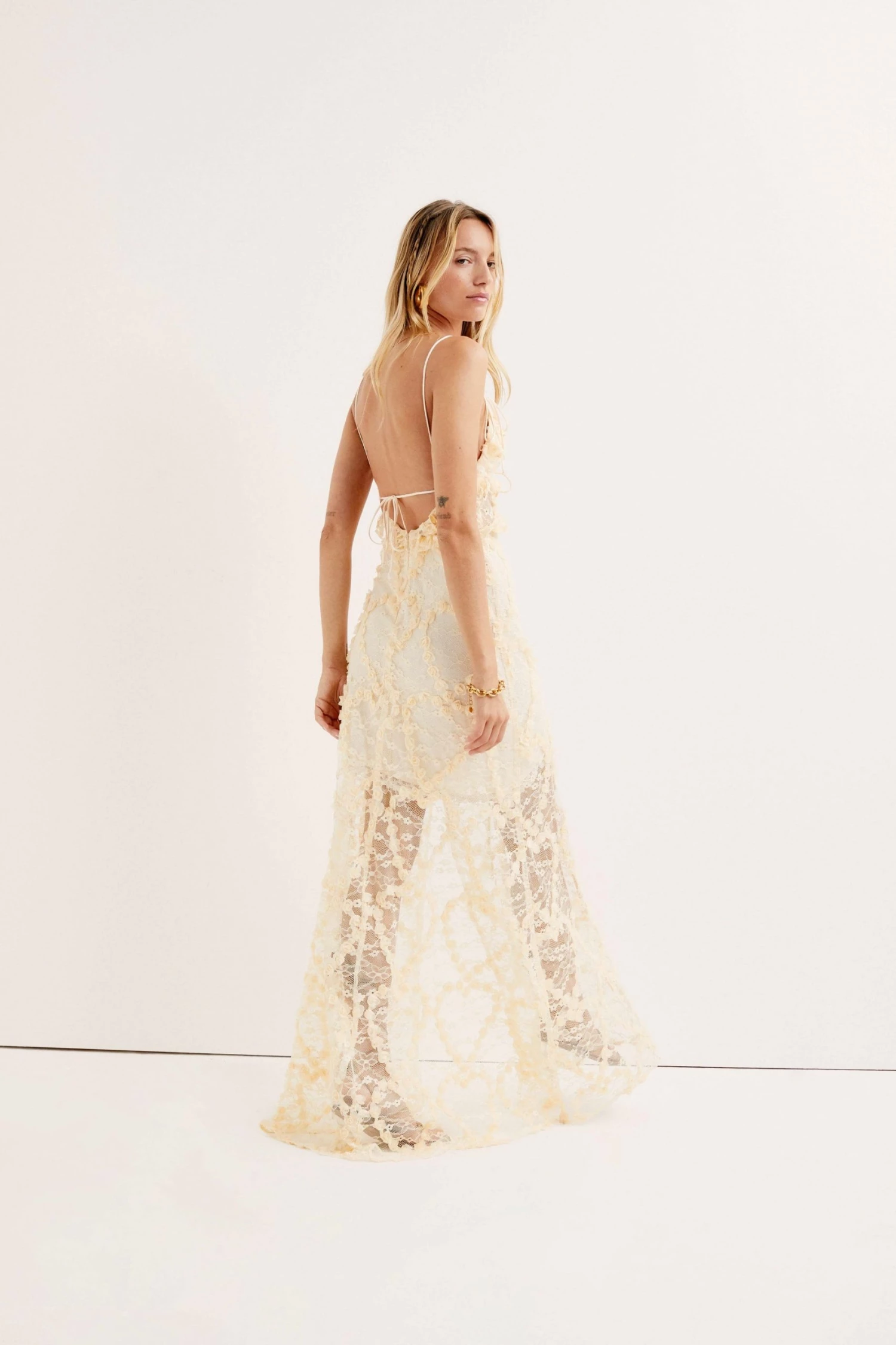Dreamy lace mini dress featuring delicate rosette hearts and satin jacquard ruffles throughout. Low open back with a delicate tie closure.
