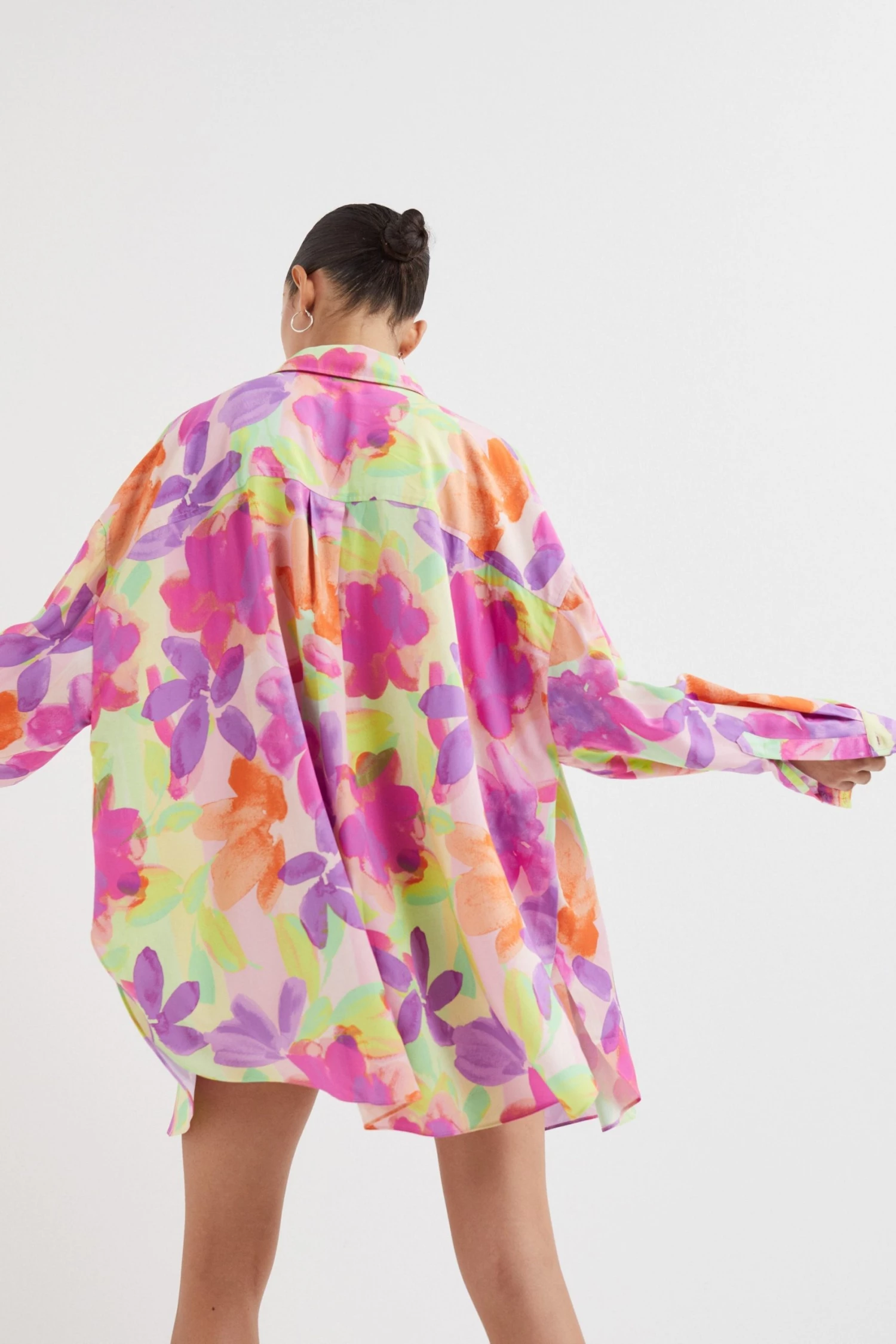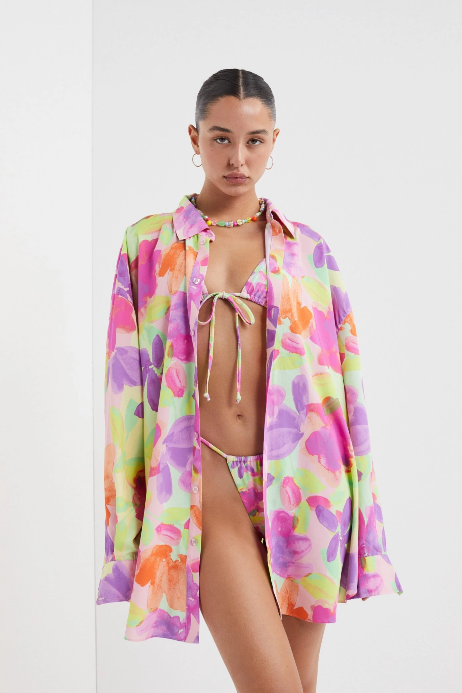 Oversized sheer button-up shirt with a radiant watercolor floral print. Pair with matching swim top & bottom.