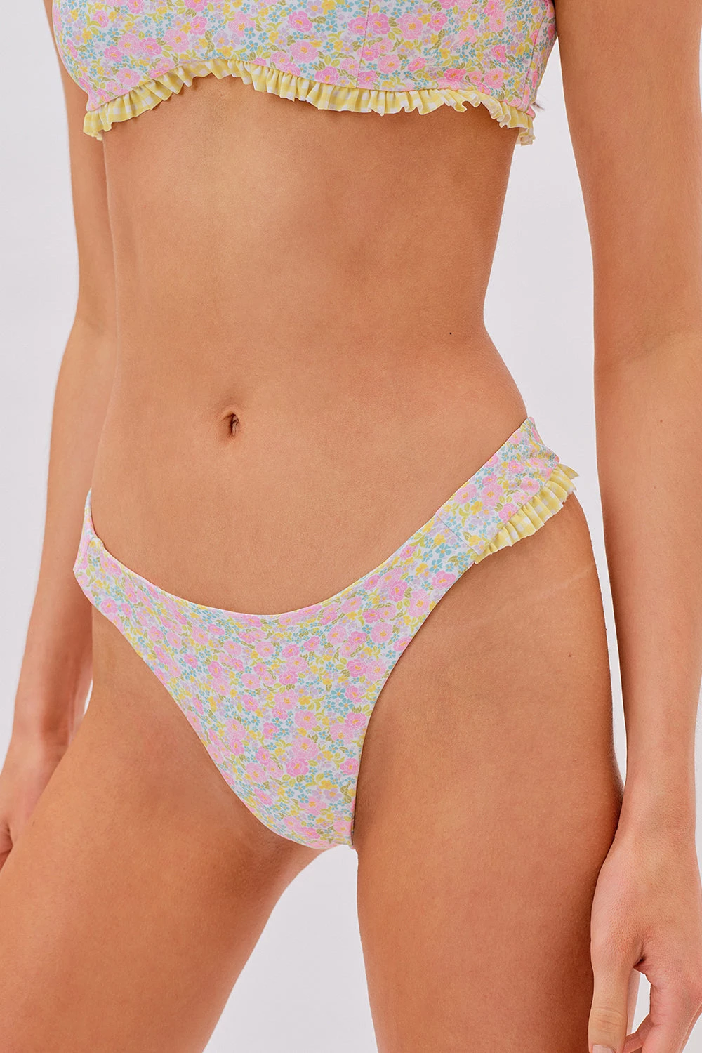 Summertime sweet hydrangea print bikini bottom featuring pretty contrast raw edge gingham print ruffle detailing, sultry high-cut leg, and thong coverage.