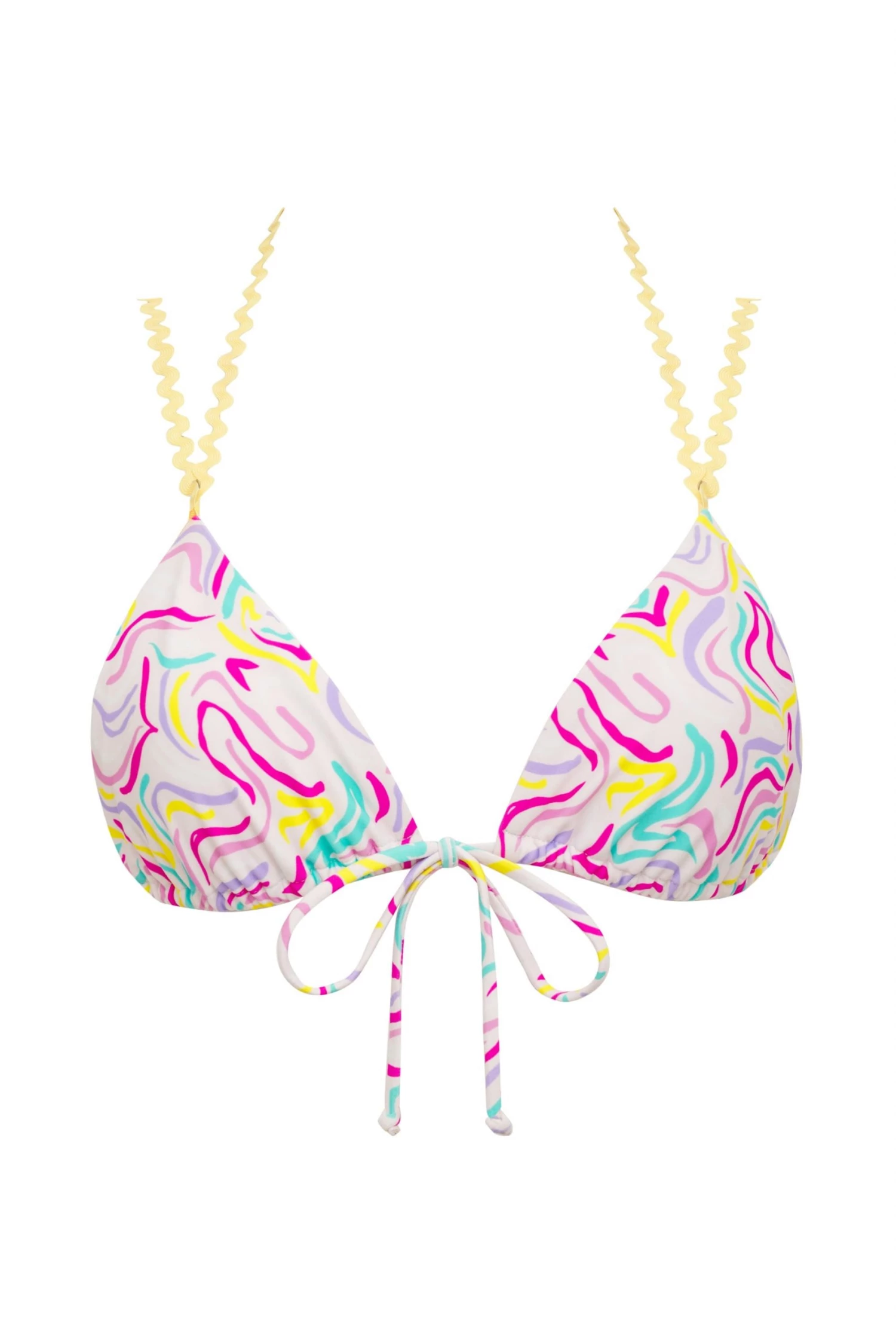 80s-inspired triangle bikini top featuring rickrack detailing at adjustable halter shoulder straps. Delicate ties at front and back.