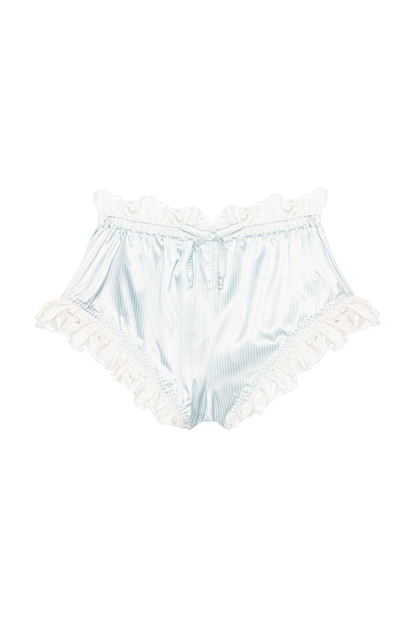 Dreamy striped stretch satin sleep short featuring dainty bow and floral embroidery and a ruffled waist panel. Pair with the matching bralette for the perfect lounge look.