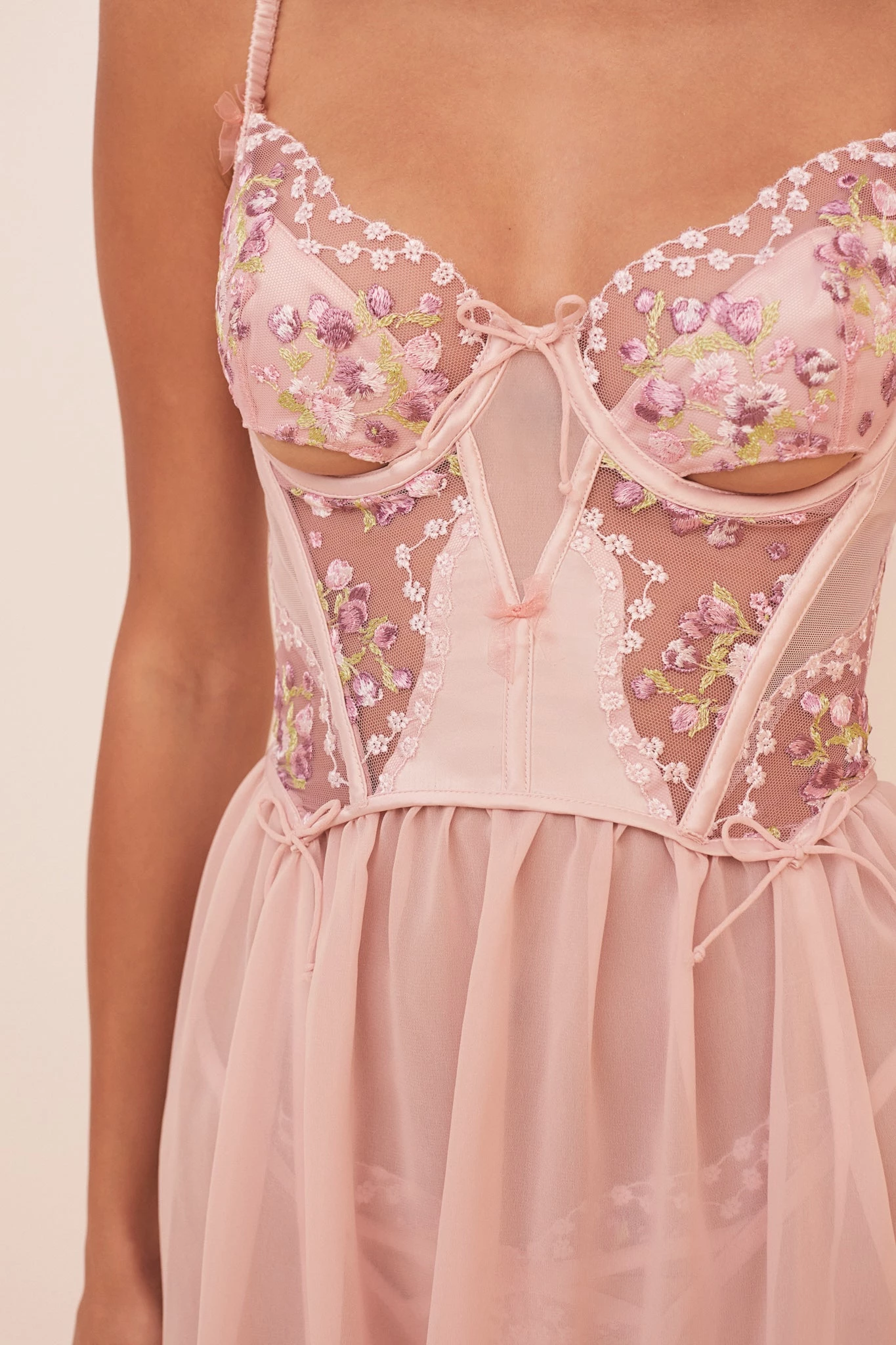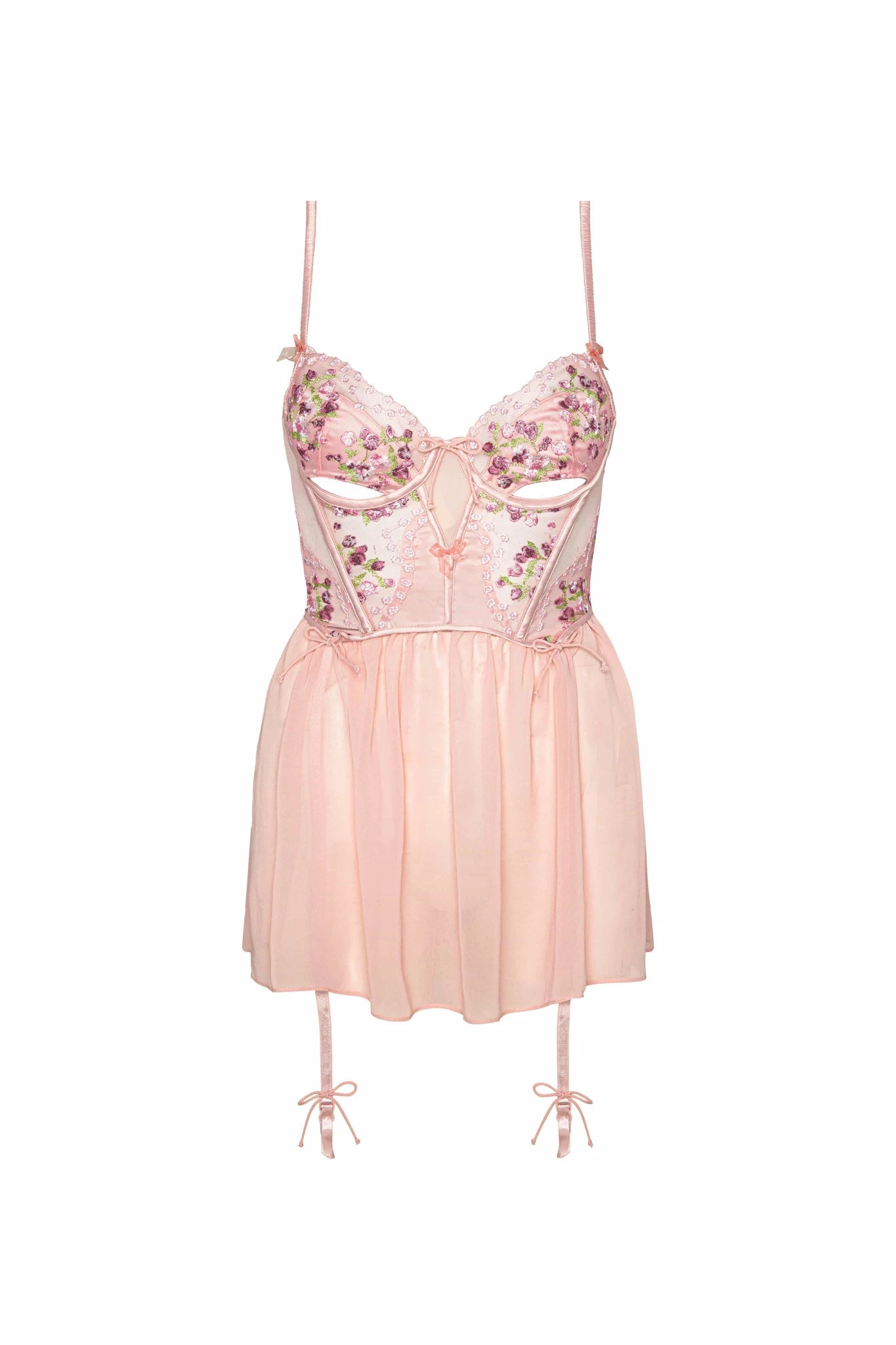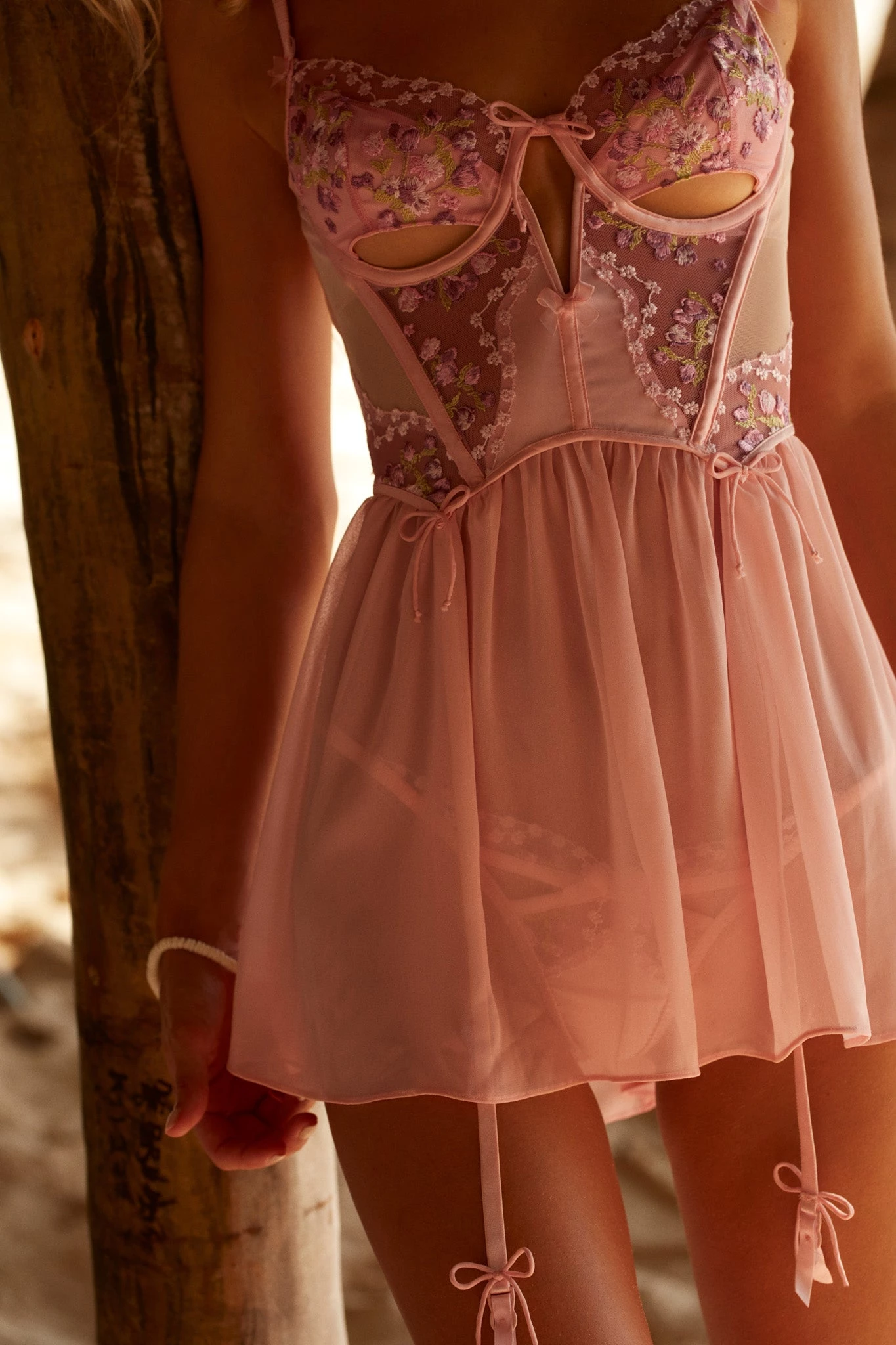 A style that’s made to be worn anywhere, featuring a satin-trimmed, embroidery-covered bustier and semi-sheer chiffon skirt concealing garter straps underneath.