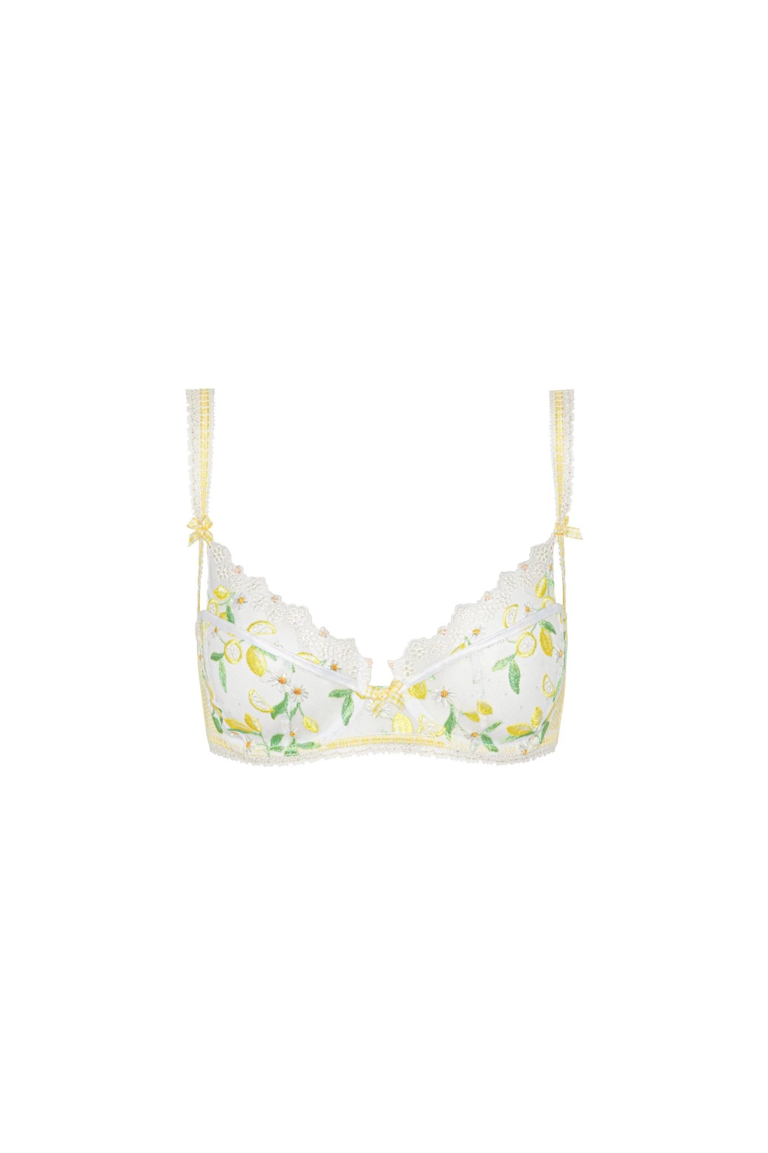 When life gives you lemons…squeeze them into your top drawer. Citrus fruits mix with daises for a fresh twist on embroidery. Featured on an extra sweet demi bra combining scalloped eyelet lace, gingham chiffon, subtle cutouts, and bow details.