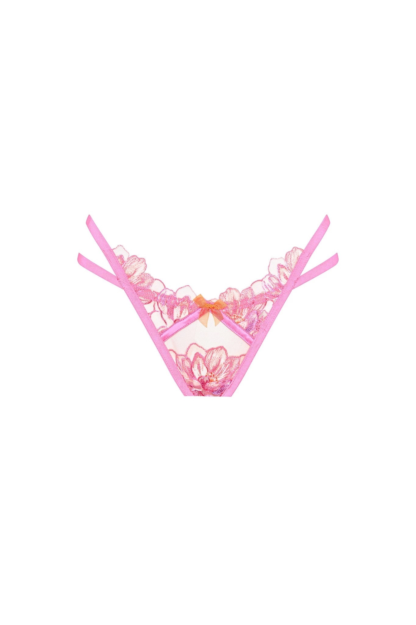 Say aloha to to ravishing hibiscus blooms flowering across an exquisitely embroidered thong with mingling shades of shocking pink and magenta. Complete with strappy details at the sides and back.