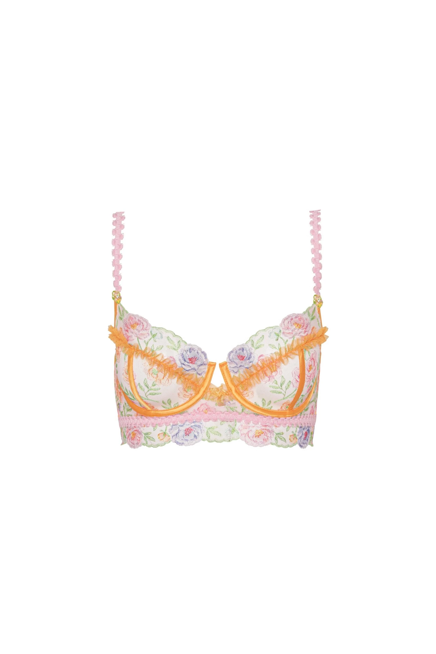 This breathtaking demi style is a fantasia of amped-up pastels, floral embroidery, and craftsy trim. Pair with the matching thong and garter.