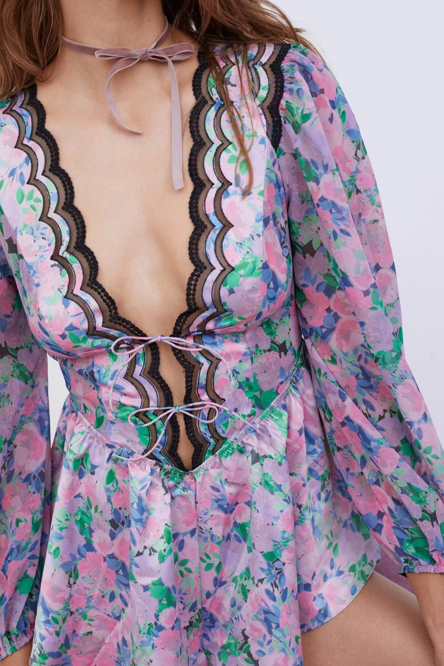 Straight from a fairytale, this floral romper combines cheeky ruffle shorts, billowy sleeves, and a deep V-neck trimmed with lace and bows.