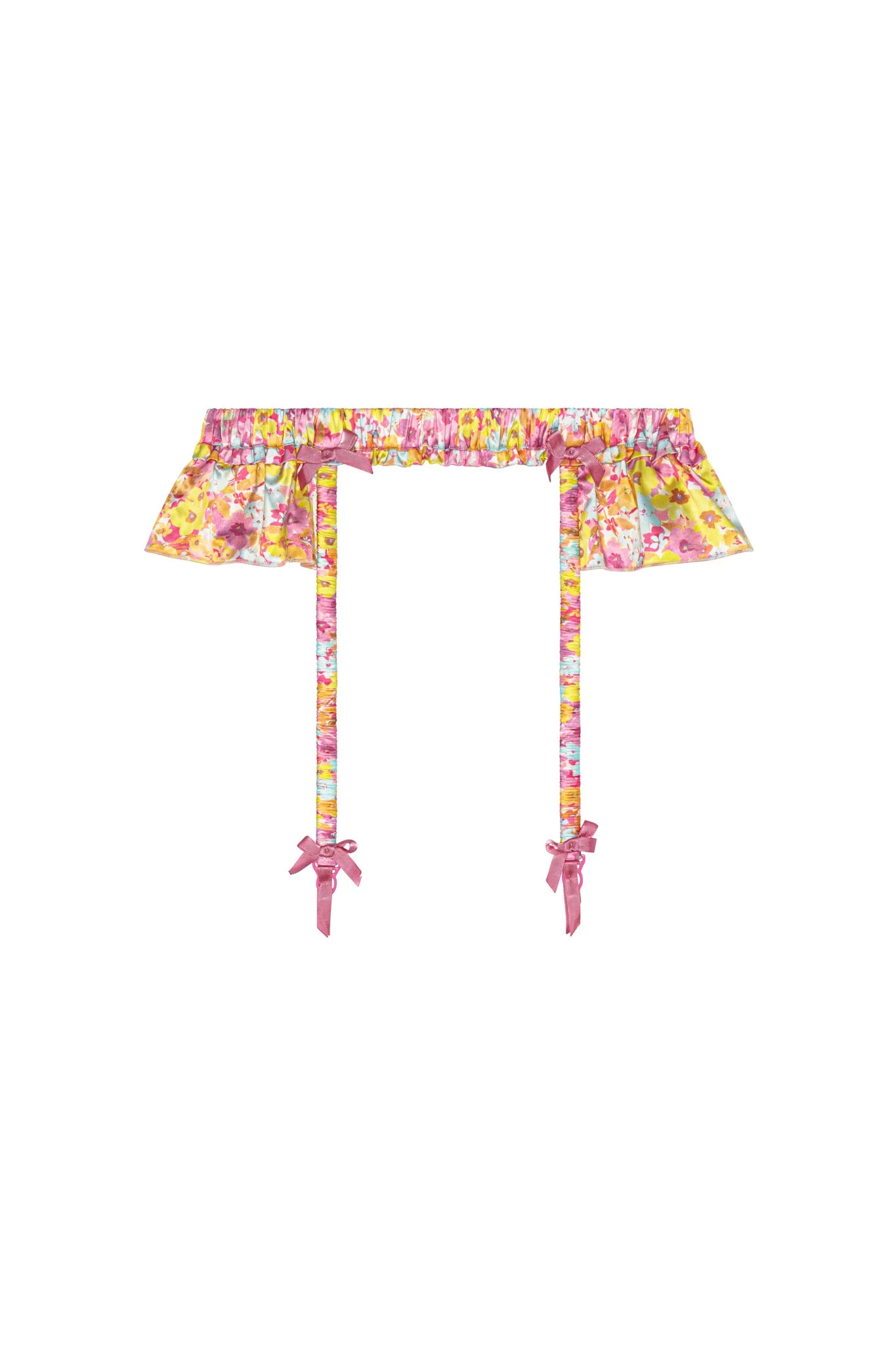 “The sweetest thing about this this flirty satin suspender belt? It’s difficult to choose between the cheerful floral print, bow accents, and shirred ruffles at the hips, waistband, and straps that attach to your favorite stockings.
