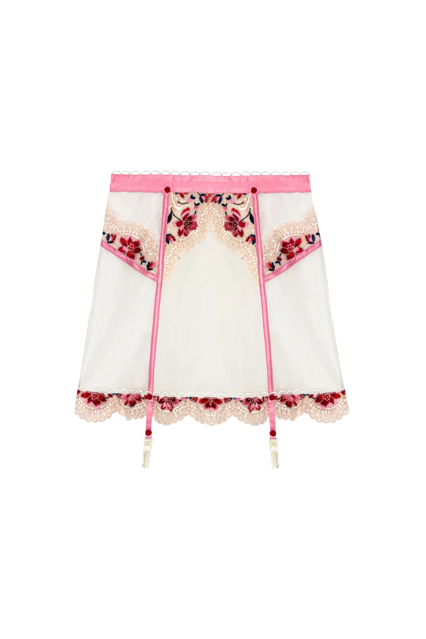 Step up your lingerie game by slipping into a sheer silk skirt—complete with scalloped lace, satin trim, floral embroidery, a lace-up front, and garter clips for showcasing sensual thigh-highs. Mix or match with coordinating Festival Rose styles.