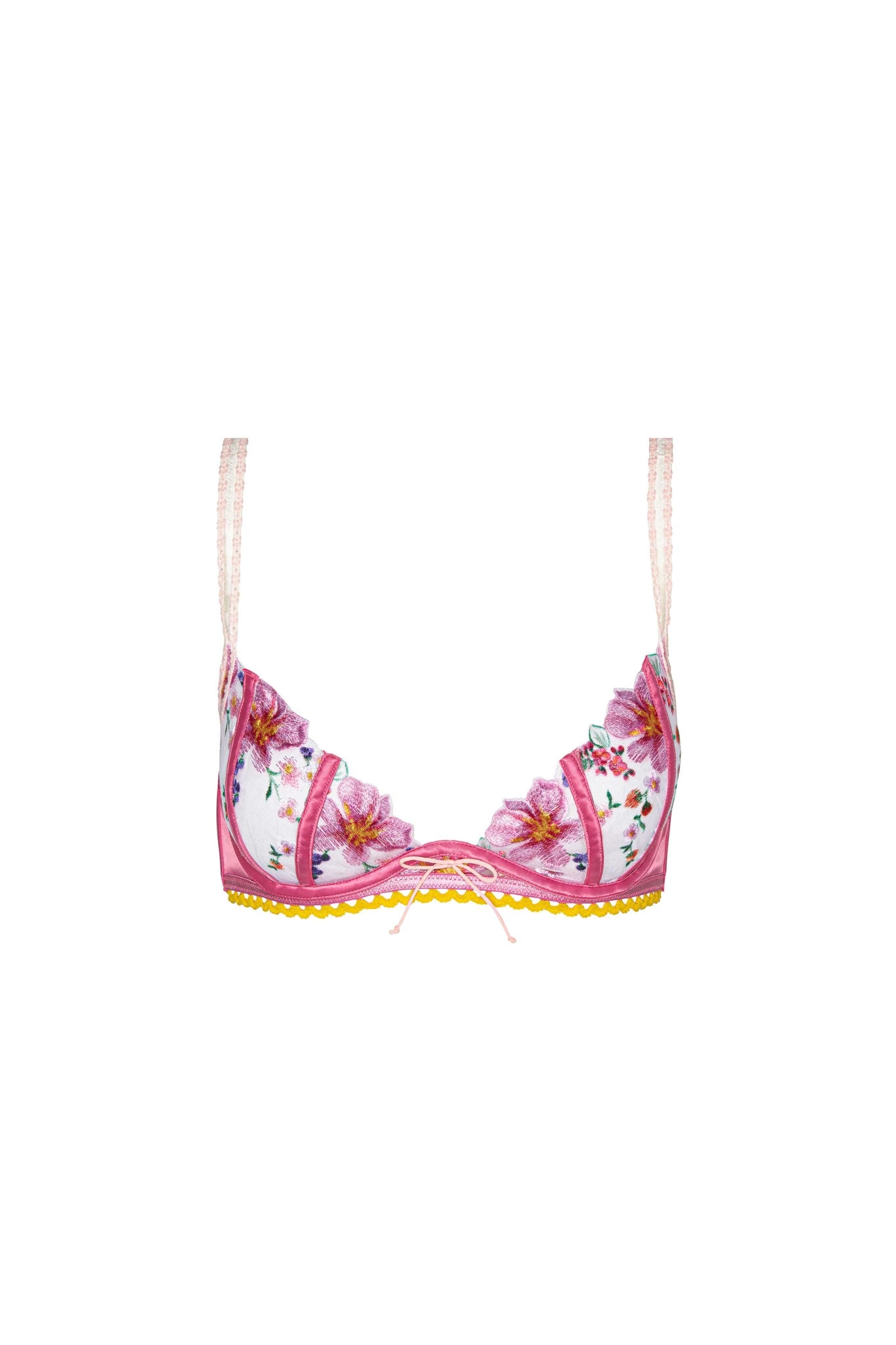 A mosaic of tropical flowers bursts over soft mesh, bordered by vibrant satin boning. Style with the matching thong panty for a statement look like no other.Â