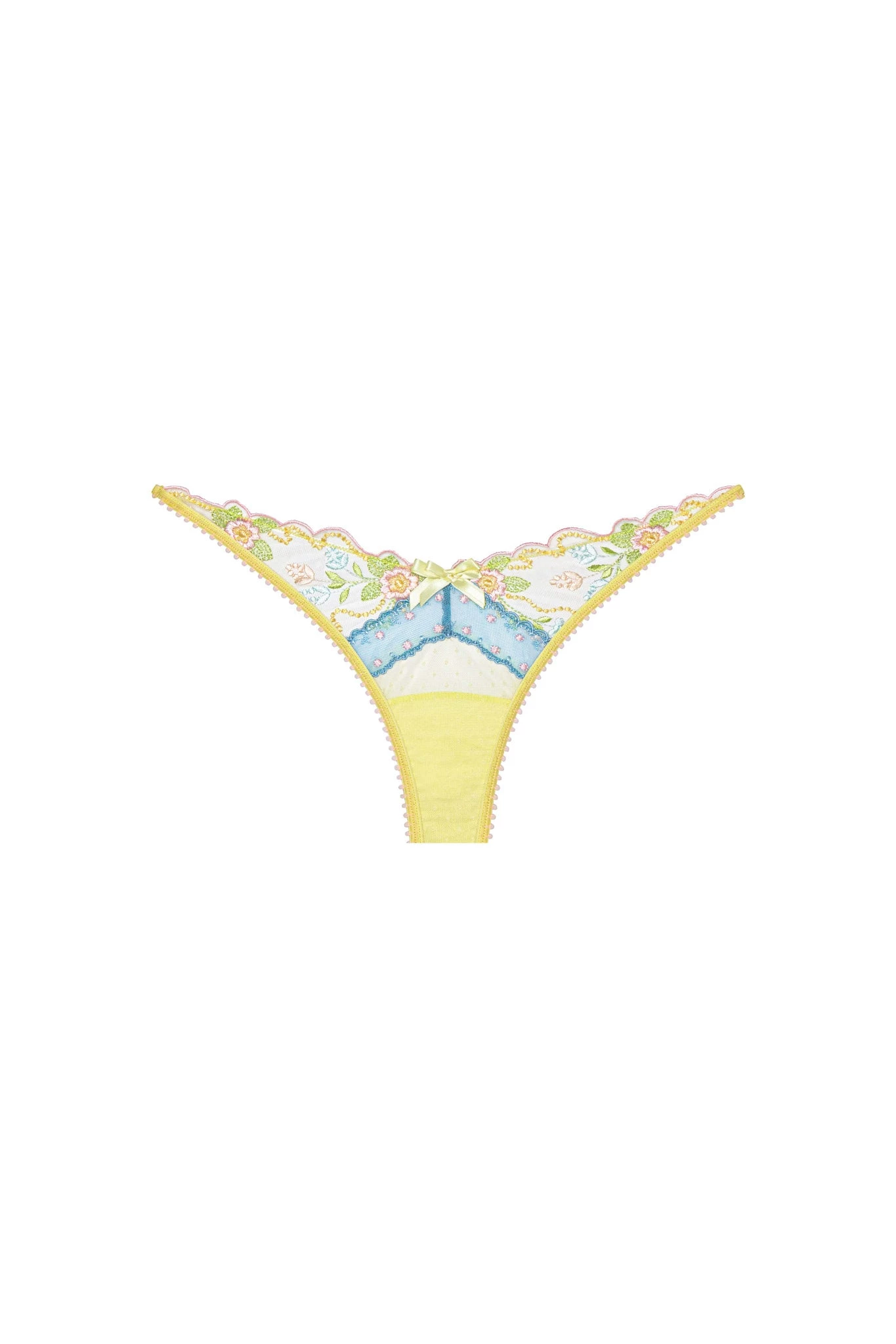 Soft pastels meet daring silhouettes on this high-leg panty, featuring floral dot embroidery, contrast lace, and multidimensional satin bows. Pairs perfectly with the Sunny Bra or Bustier.
